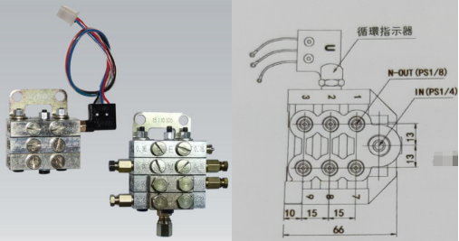 在遞進(jìn)式油路分配器片組中,設(shè)有循環(huán)指示桿,分配器每一次工作循環(huán),循環(huán)指示桿動(dòng)作一次,當(dāng)指示桿伸出接觸到循環(huán)指示器中的微動(dòng)開(kāi)關(guān),微動(dòng)開(kāi)關(guān)動(dòng)作,以監(jiān)測(cè)潤(rùn)滑系統(tǒng)是否出現(xiàn)失壓、斷流或者超負(fù)荷的狀況。