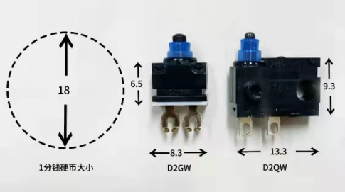 一分錢(qián)的硬幣直徑18mm,邊厚1.25mm,而D2GW開(kāi)關(guān)外形尺寸W8.3mm×D5.3mm×H6.5mm,可以說(shuō)是目前市面上體積非常小的開(kāi)關(guān)了。
