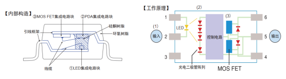 工作原理:輸入側通電后LED會發光,這束光通過在輸出側的光電二極管陣列受光后發電,再次轉換成電壓,該電壓通過控制電路變為觸發電壓來驅動MOSFET