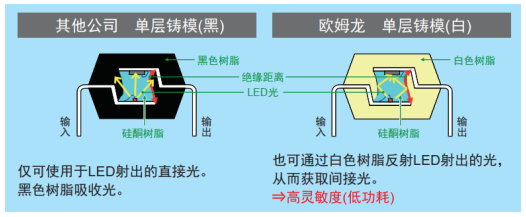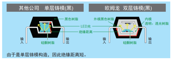 歐姆龍通過雙層鑄膜構造確保較長的絕緣距離,實現高絕緣性,更是推出了DIPSOP的黑色封裝系列產品,DIP:支持AC5000VSOP:支持AC3750V