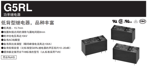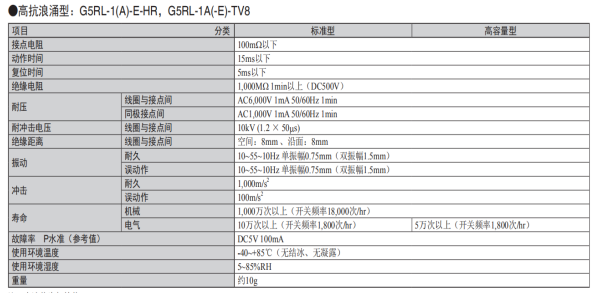 歐姆龍繼電器G5RL抗浪涌型參數: