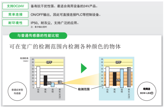 歐姆龍限定反射傳感器,不易受顏色和材質影響的限定反射型鏡面、黑色、透明物體也都會檢測出來,支持DC24V的設備內置用。不受背景及物體的顏色影響,切實檢測希望檢測的物體。