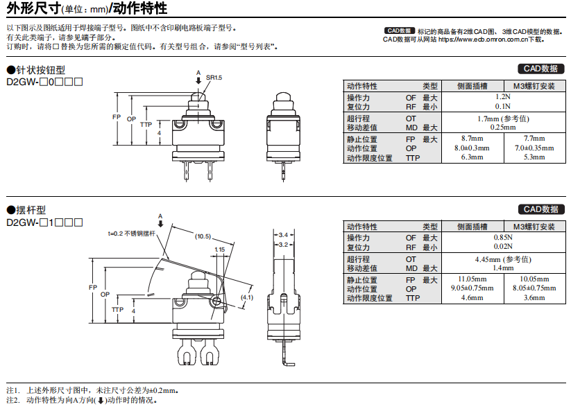 超小型微動開關D2GW系列