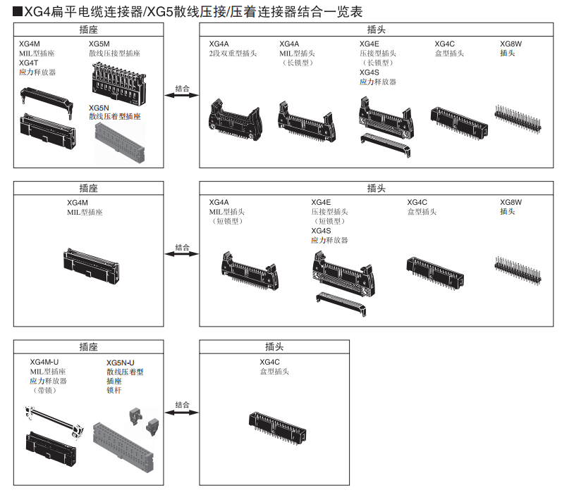 將本公司的散線壓接/壓著接器(XG5)插頭(XG8)與PCB型(XG2)組合使用可實現種類豐富的各種封裝。